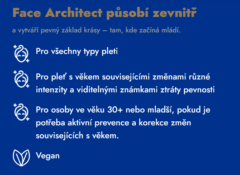 Face Architect kombinuje technologie buněčné kosmetologie s estetikou profesionální péče. Receptury jsou založeny na moderních buněčných aktivních látkách, které vzájemně synergicky působí.